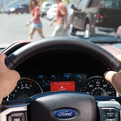 Shifting into four-wheel drive is as easy as turning a dial with the electronic shift-on-the-fly (ESOF) system. ESOF lets you choose two four-wheel-drive modes (4x4 low or high) as well as two-wheel drive. LARIAT, King Ranch® , Limited, Platinum and Raptor models also include automatic 4WD mode. The FX4 Off-Road Package includes electronic-locking rear differential (locks the rear axle completely for enhanced traction at both wheels), Hill Descent Control™, off-road tuned shock absorbers, skid plates, and "FX4 Off-Road" decal. Plus, the available 360-degree camera with split-view display is helpful when you're maneuvering in tight spaces and on off-road trails.